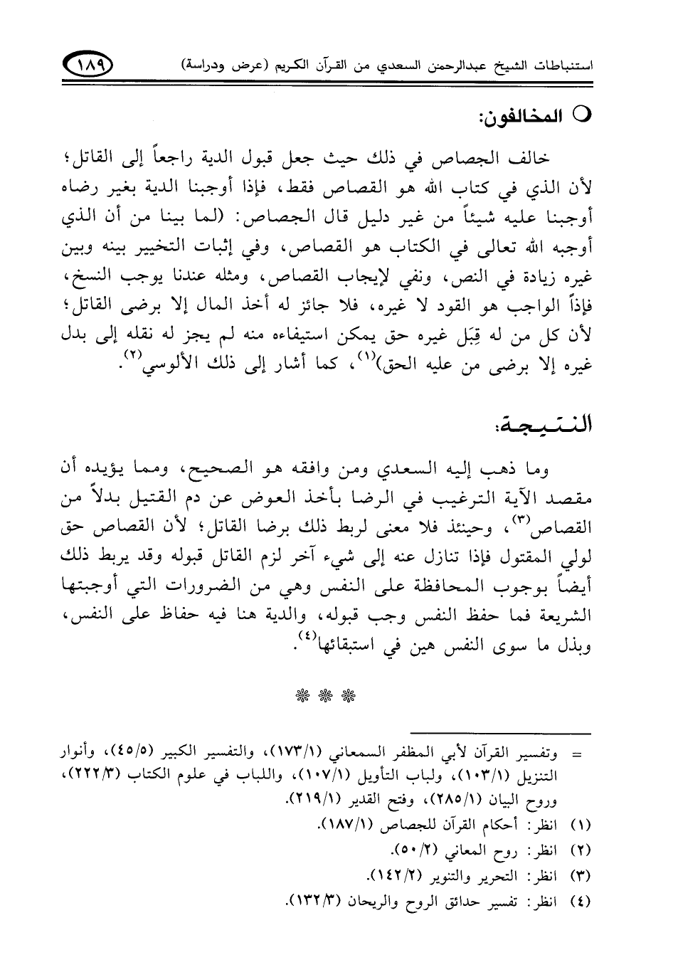 وما ذهب إليه السعدي ومن وافقه هو الصحيح، ومما يؤيده أن مقصد الآية الترغيب في الرضا بأخذ العوض عن دم القتيل بدلاً من القصاص (¬٣)، وحينئذ فلا معنى لربط ذلك برضا القاتل؛ لأن القصاص حق لولي المقتول فإذا تنازل عنه إلى شيء آخر لزم القاتل قبوله وقد يربط ذلك أيضاً بوجوب المحافظة على النفس وهي من الضرورات التي أوجبتها الشريعة فما