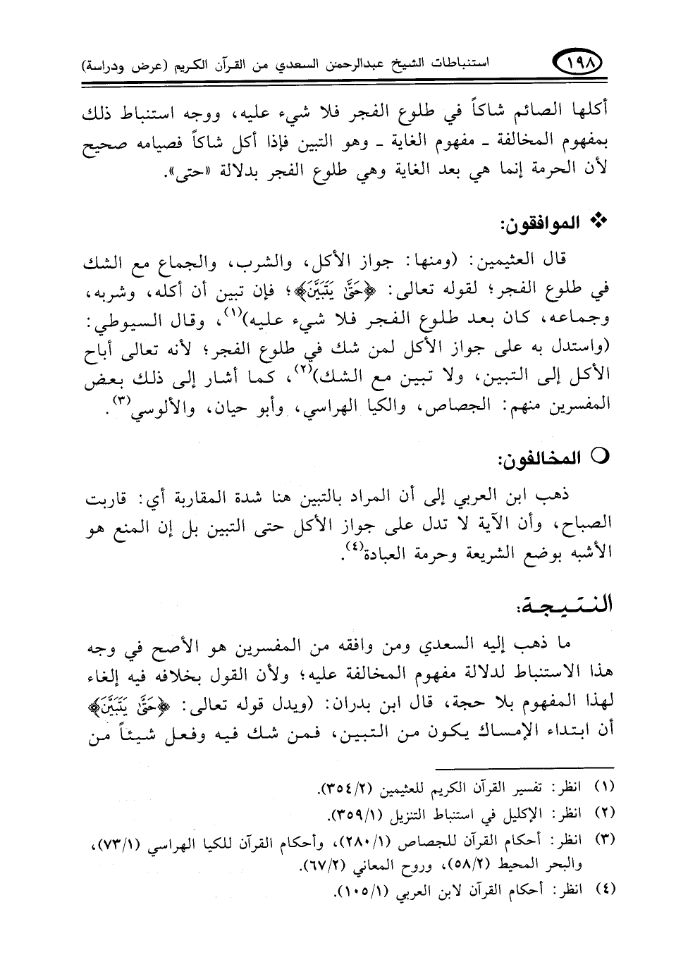 ما ذهب إليه السعدي ومن وافقه من المفسرين هو الأصح في وجه هذا الاستنباط لدلالة مفهوم المخالفة عليه؛ ولأن القول بخلافه فيه إلغاء لهذا المفهوم بلا حجة، قال ابن بدران: (ويدل قوله تعالى: {شَتَّى يَتَبَيَّنَ} أن ابتداء الإمساك يكون من التبين، فمن شك فيه وفعل شيئاً من