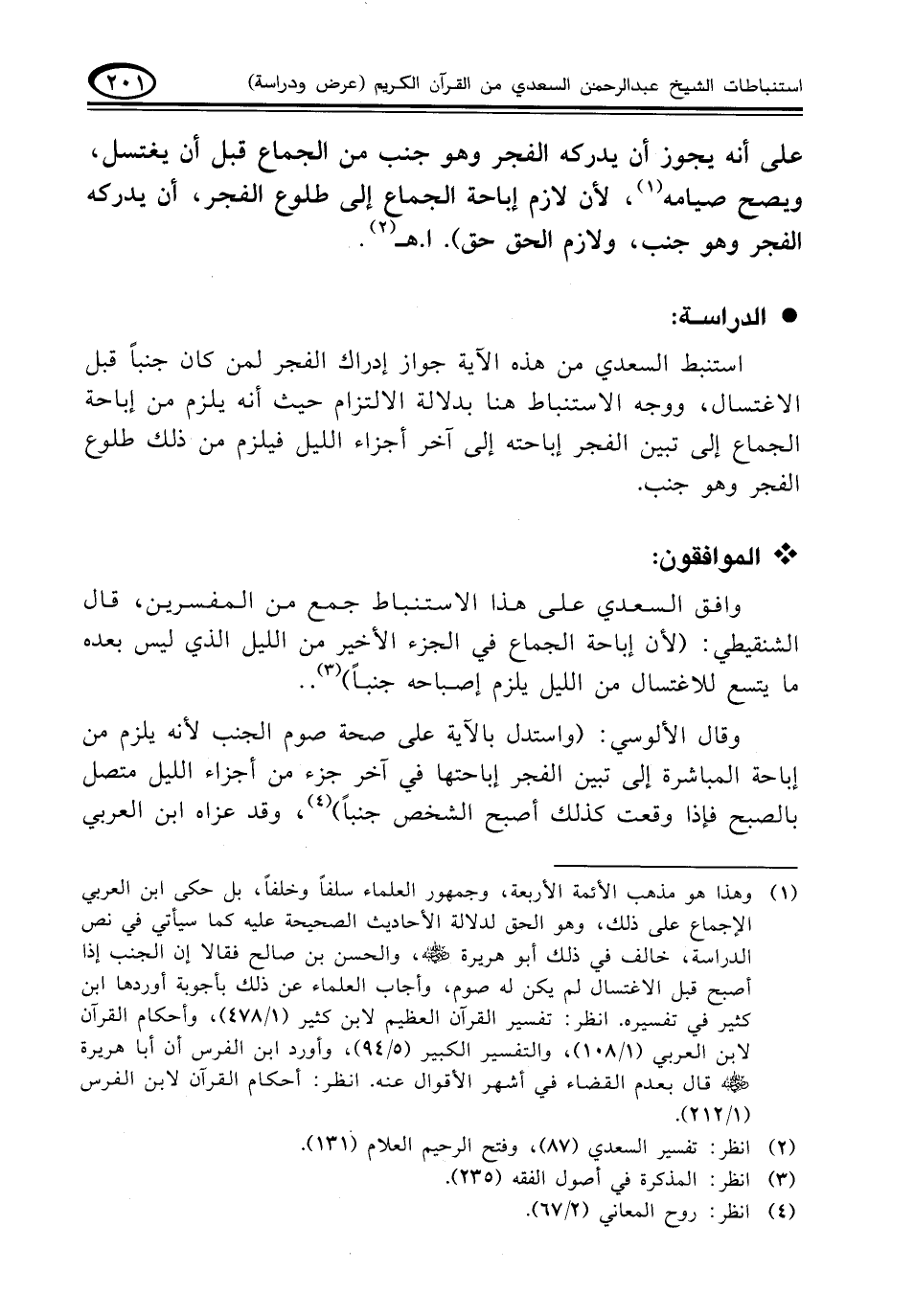 وافق السعدي على هذا الاستنباط جمع من المفسرين، قال الشنقيطي: (لأن إباحة الجماع في الجزء الأخير من الليل الذي ليس بعده ما يتسع للاغتسال من الليل يلزم إصباحه جنباً). (¬٣)