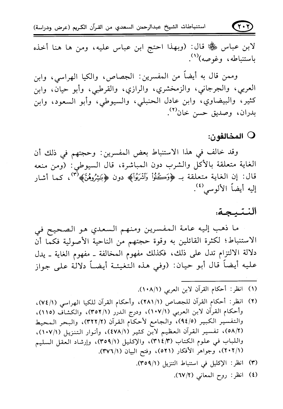 ما ذهب إليه عامة المفسرين ومنهم السعدي هو الصحيح في الاستنباط؛ لكثرة القائلين به وقوة حجتهم من الناحية الأصولية فكما أن دلالة الالتزام تدل على ذلك، فكذلك مفهوم المخالفة - مفهوم الغاية - يدل عليه أيضاً قال أبوحيان: (وفي هذه التغيئة أيضاً دلالة على جواز