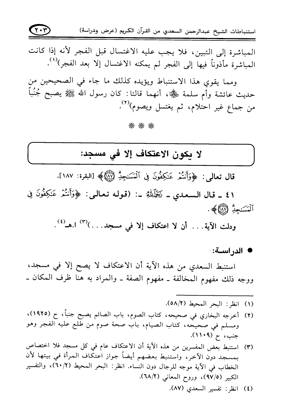 (¬٣) استنبط بعض المفسرين من هذه الآية أن الاعتكاف عام في كل مسجد فلا اختصاص بمسجد دون الآخر، واستنبط بعضهم أيضاً جواز اعتكاف المرأة في بيتها لأن الخطاب في الآية موجه للرجال دون النساء. انظر: البحر المحيط (٢/ ٦٠)، والتفسير الكبير (٥/ ٩٧)، وروح المعاني (٢/ ٦٨).