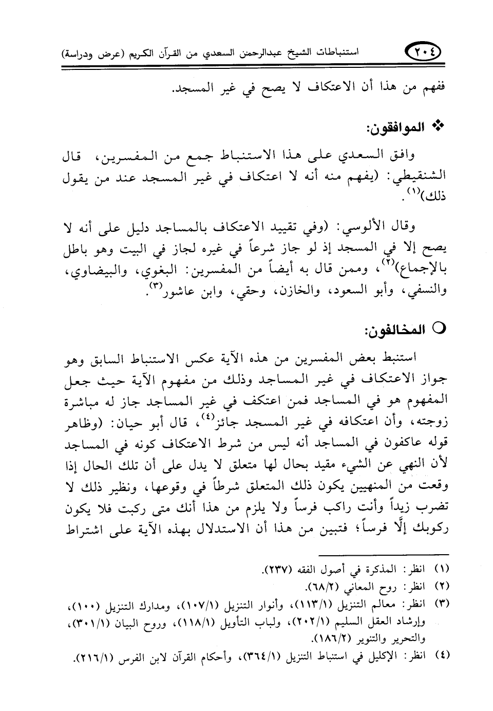 وافق السعدي على هذا الاستنباط جمع من المفسرين، قال الشنقيطي: (يفهم منه أنه لا اعتكاف في غير المسجد عند من يقول ذلك) (¬١)