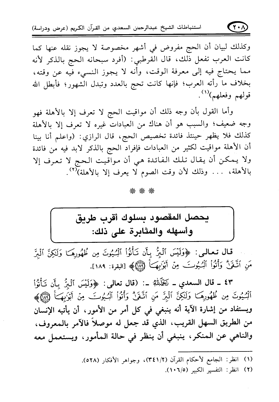 ٤٣ - قال السعدي - رحمه الله -: (قال تعالى: {وَلَيْسَ الْبِرُّ بِأَنْ تَأْتُوا الْبُيُوتَ مِنْ ظُهُورِهَا وَلَكِنَّ الْبِرَّ مَنِ اتَّقَى وَأْتُوا الْبُيُوتَ مِنْ أَبْوَابِهَا ((١٨٩)} ويستفاد من إشارة الآية أنه ينبغي في كل أمر من الأمور، أن يأتيه الإنسان من الطريق السهل القريب، الذي قد جعل له موصلا فالآمر بالمعروف، والناهي عن المنكر، ينبغي أن ينظر في حالة المأمور، ويستعمل معه