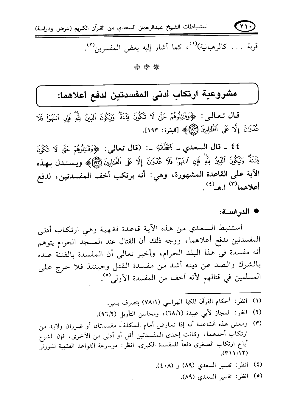 ٤٤ - قال السعدي - رحمه الله -: (قال تعالى: {وَقَاتِلُوهُمْ شَتَّى لَا تَكُونَ فِتْنَةٌ وَيَكُونَ الدِّينُ لِلَّهِ فَإِنِ انْتَهَوْا فَلَا عُدْوَانَ إِلَّا عَلَى الظَّالِمِينَ (١٩٣)} ويستدل بهذه الآية على القاعدة المشهورة، وهي: أنه يرتكب أخف المفسدتين، لدفع أعلاهما (¬٣)) ا. هـ (¬٤)