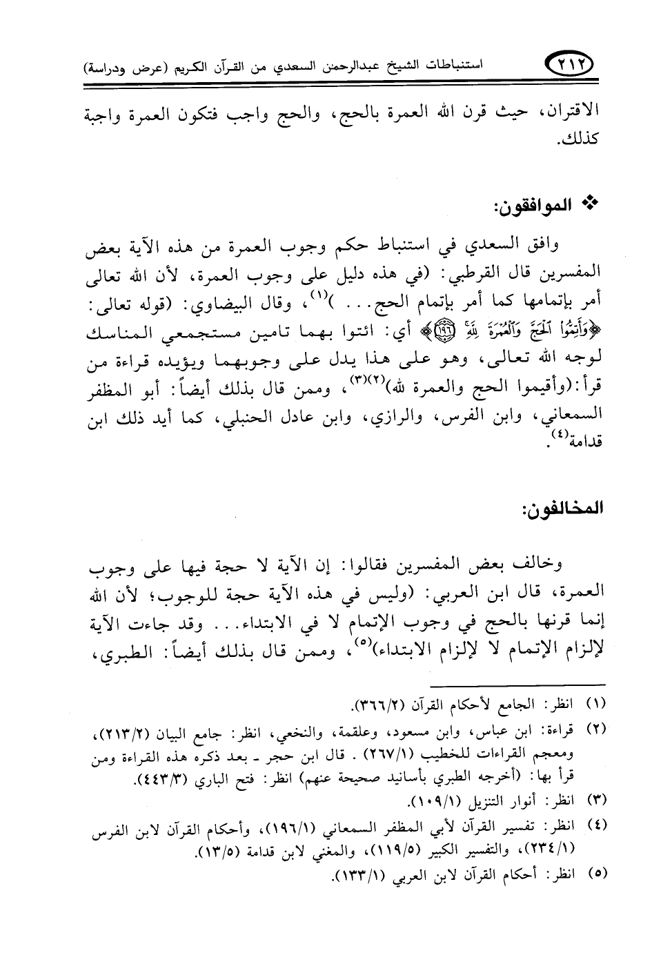 وافق السعدي في استنباط حكم وجوب العمرة من هذه الآية بعض المفسرين قال القرطبي: (في هذه دليل على وجوب العمرة، لأن الله تعالى أمر بإتمامها كما أمر بإتمام الحج. . .) (¬١)، وقال البيضاوي: (قوله تعالى: {وَأَتِمُّوا الْحَجَّ وَالْعُمْرَةَ لِلَّهِ (١٩٦)} أي ائتوا بهما تامين مستجمعي المناسك لوجه الله تعالى، وهو على هذا يدل على وجوبهما ويؤيده قراءة من قرأ: {وَأَقِيمُوا الحج والعمرة لِلَّهِ} (¬٢)) (¬٣)، وممن قال بذلك أيضاً: أبوالمظفر السمعاني، وابن الفرس، والرازي، وابن عادل الحنبلي، كما أيد ذلك ابن قدامة (¬٤).