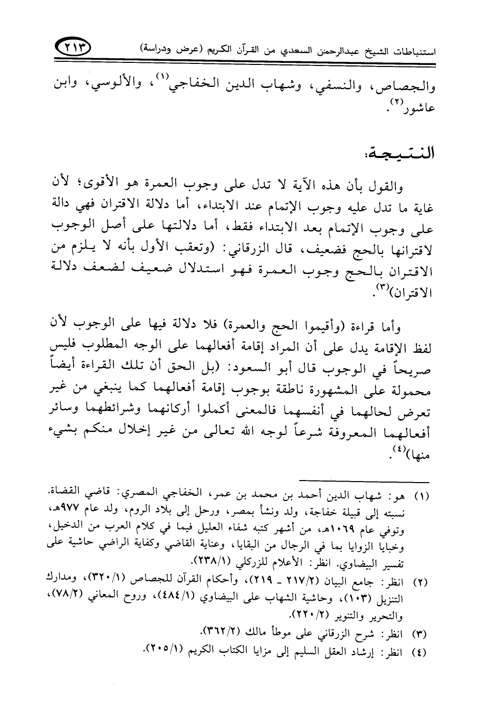 وأما قراءة (وأقيموا الحج والعمرة) فلا دلالة فيها على الوجوب لأن لفظ الإقامة يدل على أن المراد إقامة أفعالهما على الوجه المطلوب فليس صريحاً في الوجوب قال أبو السعود: (بل الحق أن تلك القراءة أيضا محمولة على المشهورة ناطقة بوجوب إقامة أفعالهما كما ينبغي من غير تعرض لحالهما في أنفسهما فالمعنى أكملوا أركانهما وشرائطهما وسائر أفعالهما المعروفة شرعاً لوجه الله تعالى من غير إخلال منكم بشيء منها) (¬٤).