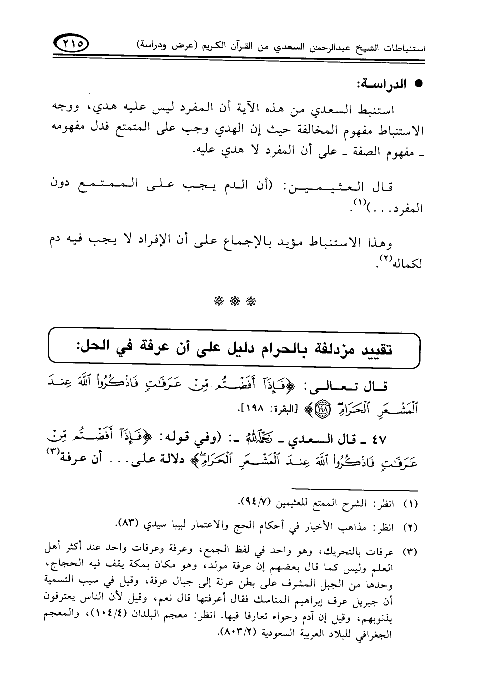 ٤٧ - قال السعدي - رحمه الله -: (وفي قوله: {فَإِذَا أَفَضْتُمْ مِنْ عَرَفَاتٍ فَاذْكُرُوا اللَّهَ عِنْدَ الْمَشْعَرِ الْحَرَامِ} دلالة على. . . أن عرفة (¬٣)