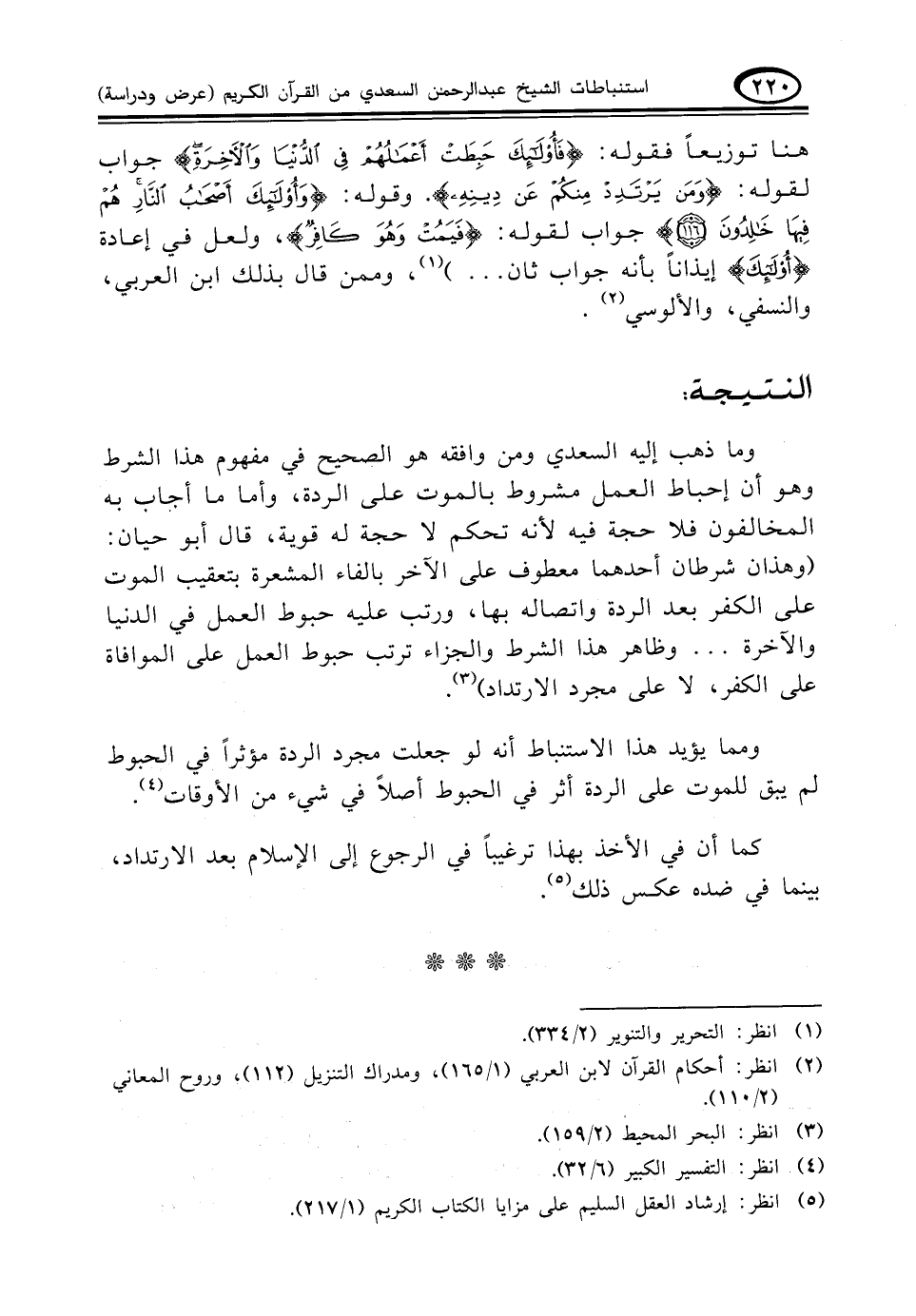 وما ذهب إليه السعدي ومن وافقه هو الصحيح في مفهوم هذا الشرط وهو أن إحباط العمل مشروط بالموت على الردة، وأما ما أجاب به المخالفون فلا حجة فيه لأنه تحكم لا حجة له قوية، قال أبوحيان: (وهذان شرطان أحدهما معطوف على الآخر بالفاء المشعرة بتعقيب الموت على الكفر بعد الردة واتصاله بها، ورتب عليه حبوط العمل في الدنيا والآخرة. . . وظاهر هذا الشرط والجزاء ترتب حبوط العمل على الموافاة على الكفر، لا على مجرد الارتداد) (¬٣)