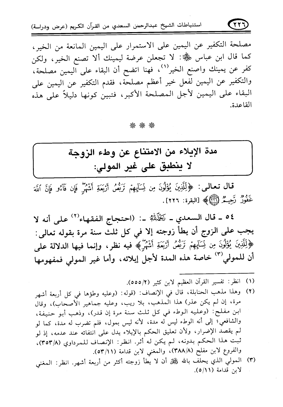 ٥٤ - قال السعدي - رحمه الله -: (احتجاج الفقهاء (¬٢) على أنه لا يجب على الزوج أن يطأ زوجته إلا في كل ثلث سنة مرة بقوله تعالى: {لِلَّذِينَ يُؤْلُونَ مِنْ نِسَائِهِمْ تَرَبُّصُ أَرْبَعَةِ أَشْهُرٍ} فيه نظر , وإنما فيها الدلالة على أن للمولي (¬٣) خاصة هذه المدة لأجل إيلائه, وأما غير المولي فمفهومها
