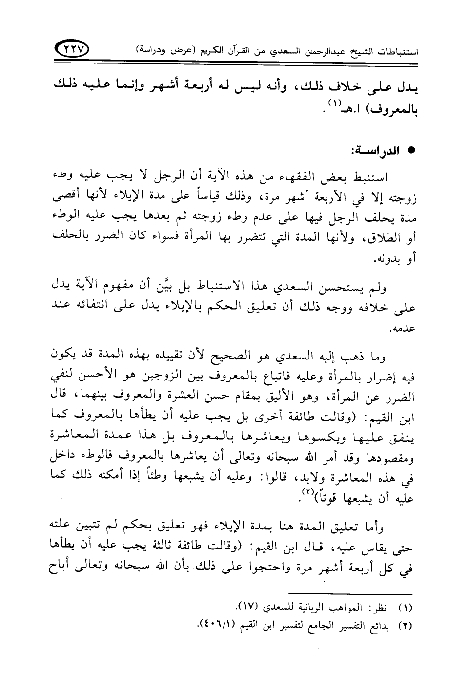 ولم يستحسن السعدي هذا الاستنباط بل بين أن مفهوم الآية يدل على خلافه ووجه ذلك أن تعليق الحكم بالإيلاء يدل على انتفائه عند عدمه.