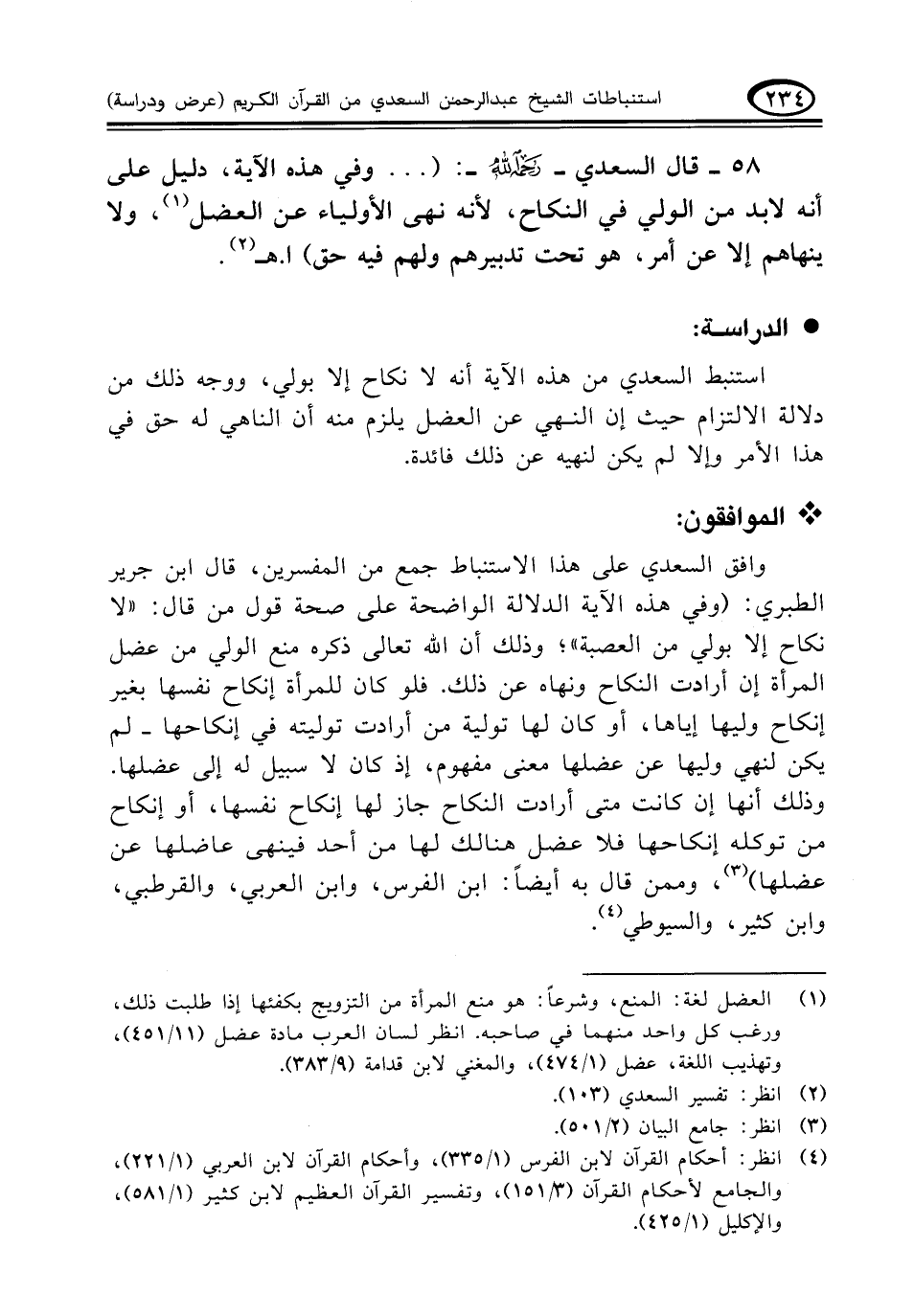 وافق السعدي على هذا الاستنباط جمع من المفسرين، قال ابن جرير الطبري: (وفي هذه الآية الدلالة الواضحة على صحة قول من قال: "لا نكاح إلا بولي من العصبة"؛ وذلك أن الله تعالى ذكره منع الولي من عضل المرأة إن أرادت النكاح ونهاه عن ذلك. فلو كان للمرأة إنكاح نفسها بغير إنكاح وليها إياها، أو كان لها تولية من أرادت توليته في إنكاحها -لم يكن لنهي وليها عن عضلها معنى مفهوم، إذ كان لا سبيل له إلى عضلها. وذلك أنها إن كانت متى أردات النكاح جاز لها إنكاح نفسها، أو إنكاح من توكله إنكاحها فلا عضل هنالك لها من أحد فينهى عاضلها عن عضلها) (¬٣)، وممن قال به أيضاً: ابن الفرس، وابن العربي، والقرطبي، وابن كثير، والسيوطي. (¬٤)