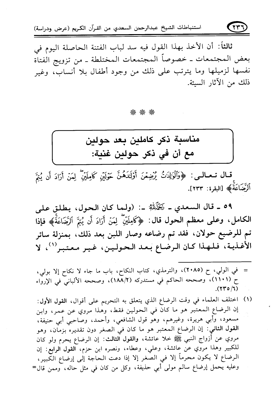 ٥٩ - قال السعدي - رحمه الله -: (ولما كان الحول، يطلق على الكامل، وعلى معظم الحول قال: {كَامِلَيْنِ لِمَنْ أَرَادَ أَنْ يُتِمَّ الرَّضَاعَةَ} فإذا تم للرضيع حولان، فقد تم رضاعه وصار اللبن بعد ذلك، بمنزلة سائر الأغذية، فلهذا كان الرضاع بعد الحولين، غير معتبر (¬١)، لا