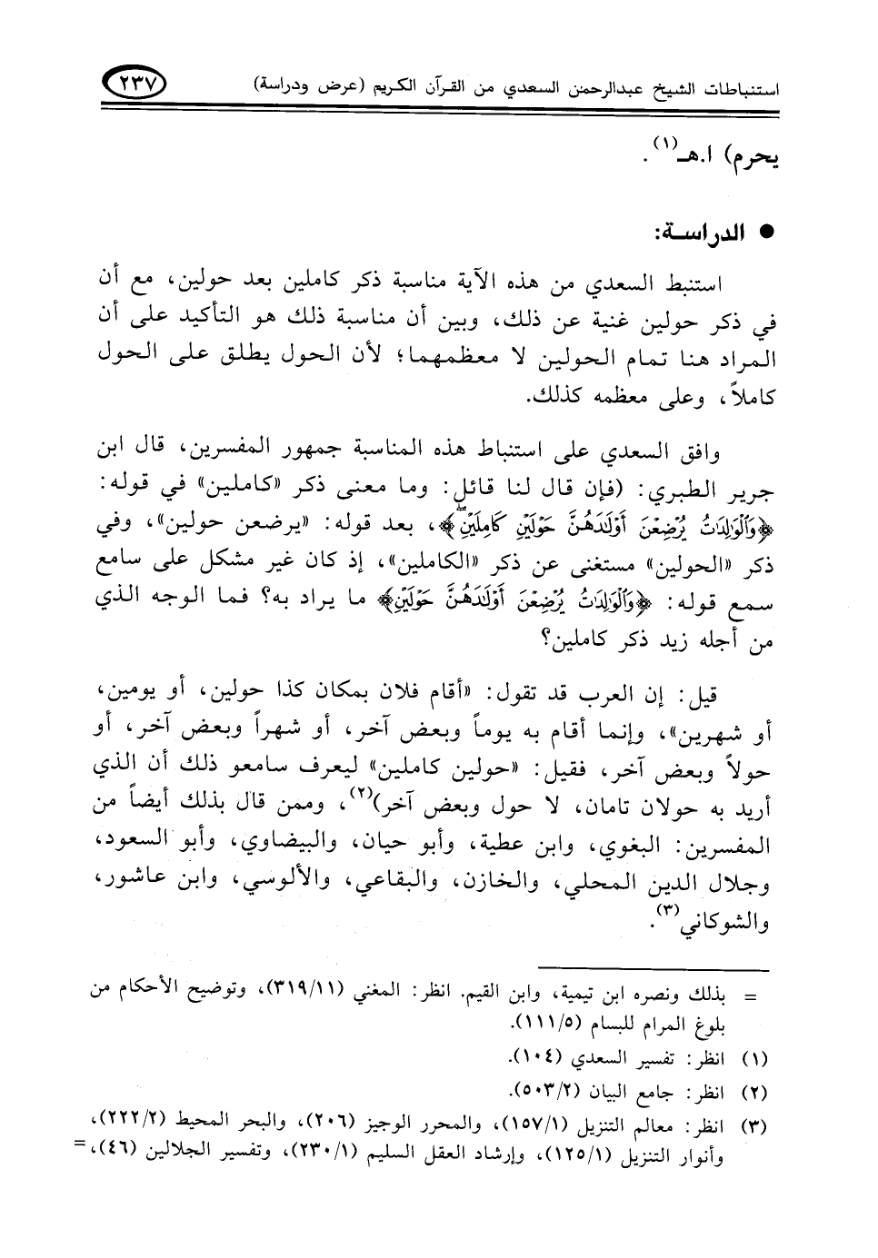 وافق السعدي على استنباط هذه المناسبة جمهور المفسرين، قال ابن جرير الطبري: (فإن قال لنا قائل: وما معنى ذكر"كاملين" في قوله: {وَالْوَالِدَاتُ يُرْضِعْنَ أَوْلَادَهُنَّ حَوْلَيْنِ كَامِلَيْنِ}، بعد قوله: "يرضعن حولين"، وفي ذكر"الحولين" مستغنى عن ذكر"الكاملين"، إذ كان غير