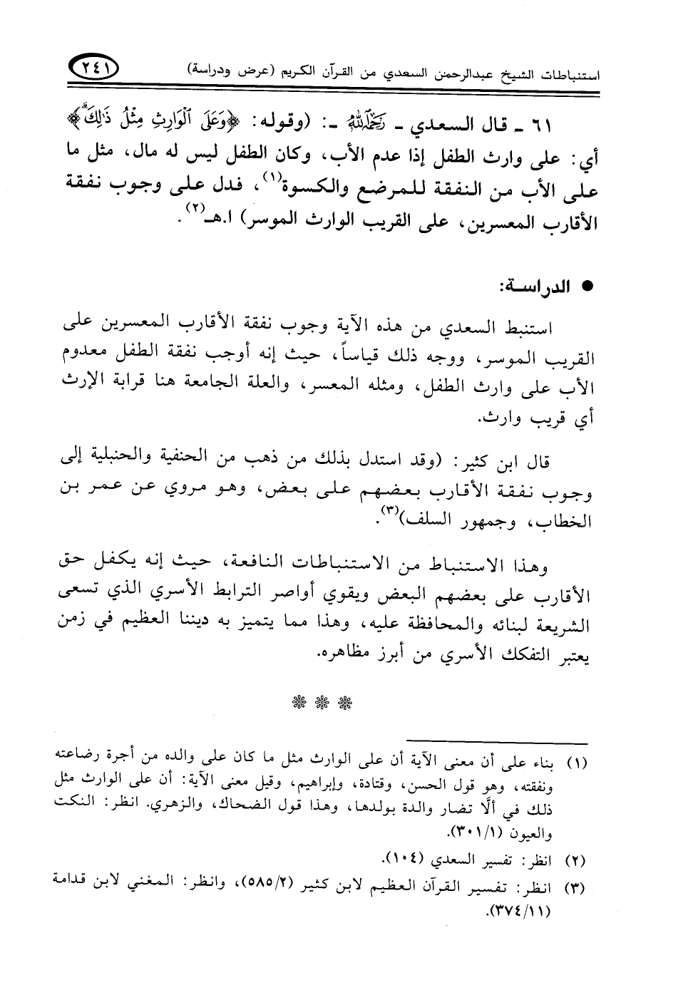 ٦١ - قال السعدي - رحمه الله -: (وقوله: {وَعَلَى الْوَارِثِ مِثْلُ ذَلِكَ} أي: على وارث الطفل إذا عدم الأب، وكان الطفل ليس له مال، مثل ما على الأب من النفقة للمرضع والكسوة (¬١)، فدل على وجوب نفقة الأقارب المعسرين، على القريب الوارث الموسر) ا. هـ (¬٢)