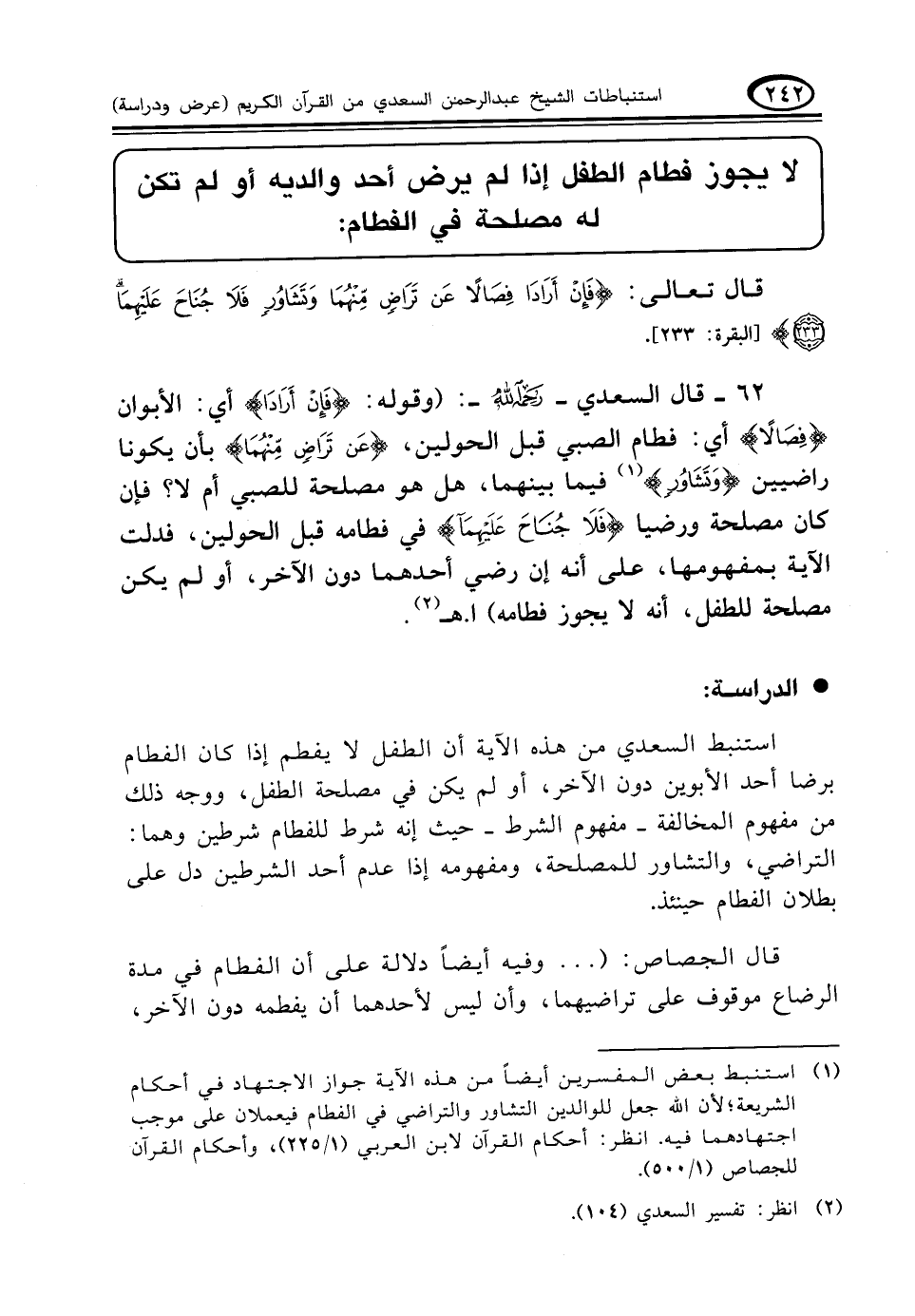 ٦٢ - قال السعدي - رحمه الله -: (وقوله: {فَإِنْ أَرَادَا} أي: الأبوان {فِصَالًا} أي: فطام الصبي قبل الحولين، {عَنْ تَرَاضٍ مِنْهُمَا} بأن يكونا راضيين {وَتَشَاوُرٍ} (¬١) فيما بينهما، هل هو مصلحة للصبي أم لا؟ فإن كان مصلحة ورضيا {فَلَا جُنَاحَ عَلَيْهِمَا} في فطامه قبل الحولين، فدلت الآية بمفهومها، على أنه إن رضي أحدهما دون الآخر، أو لم يكن مصلحة للطفل، أنه لا يجوز فطامه) ا. هـ (¬٢)