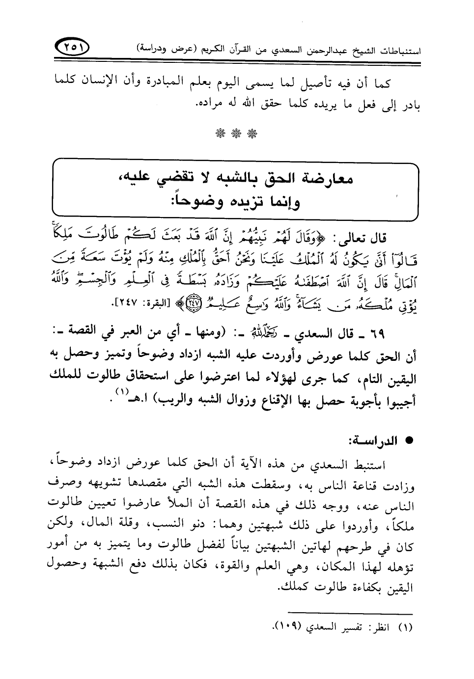 ٦٩ - قال السعدي -رحمه الله-: (ومنها-أي من العبر في القصة-: أن الحق كلما عورض وأوردت عليه الشبه ازداد وضوحاً وتميز وحصل به اليقين التام كما جرى لهؤلاء، لما اعترضوا على استحقاق طالوت للملك أجيبوا بأجوبة حصل بها الإقناع وزوال الشبه والريب) ا. هـ (¬١)
