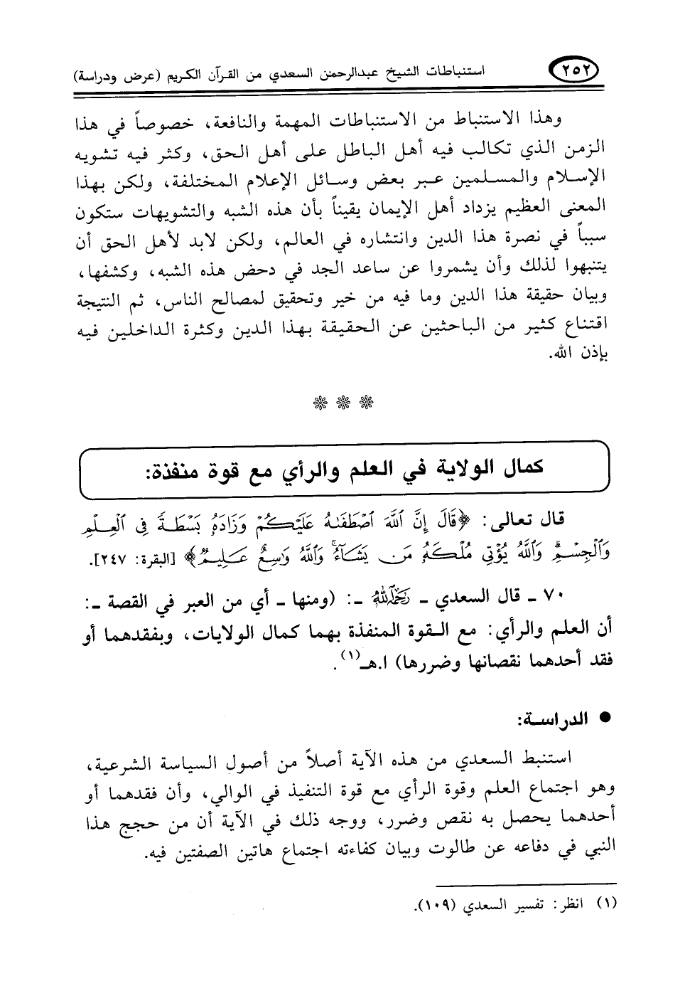 ٧٠ - قال السعدي -رحمه الله-: (ومنها-أي من العبر في القصة-: أن العلم والرأي: مع القوة المنفذة بهما كمال الولايات، وبفقدهما أو فقد أحدهما نقصانها وضررها) ا. هـ (¬١)