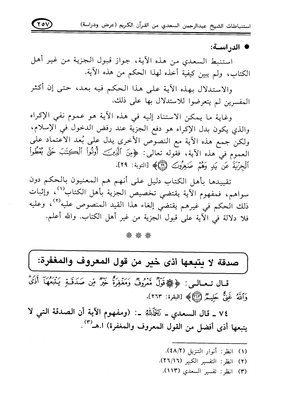 ٧٤ - قال السعدي -رحمه الله-: (ومفهوم الآية أن الصدقة التي لا يتبعها أذى أفضل من القول المعروف والمغفرة) ا. هـ (¬٣)