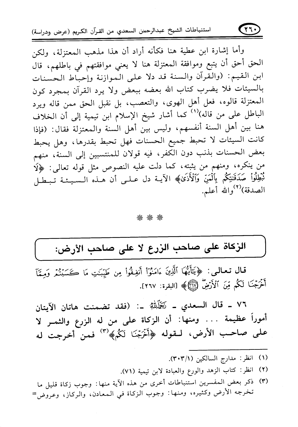 ٧٦ - قال السعدي -رحمه الله-: (فقد تضمنت هاتان الآيتان أموراً عظيمة. . . ومنها: أن الزكاة على من له الزرع والثمر لا على صاحب الأرض، لقوله {أَخْرِجْنَا لَكُمْ} (¬٣) فمن أخرجت له