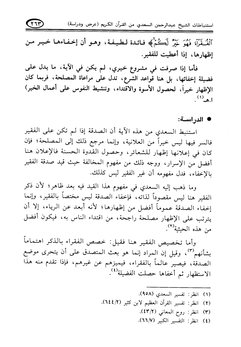 استنبط السعدي من هذه الآية أن الصدقة إذا لم تكن على الفقير فالسر فيها ليس خيراً من العلانية، وإنما مرجع ذلك إلى المصلحة؛ فإن كان في إعلانها إظهار للشعائر، وحصول القدوة الحسنة فالإعلان هنا أفضل من الإسرار، ووجه ذلك من مفهوم المخالفة حيث قيد صدقة الفقير بالإخفاء، فدل مفهومه أن غير الفقير ليس كذلك.
