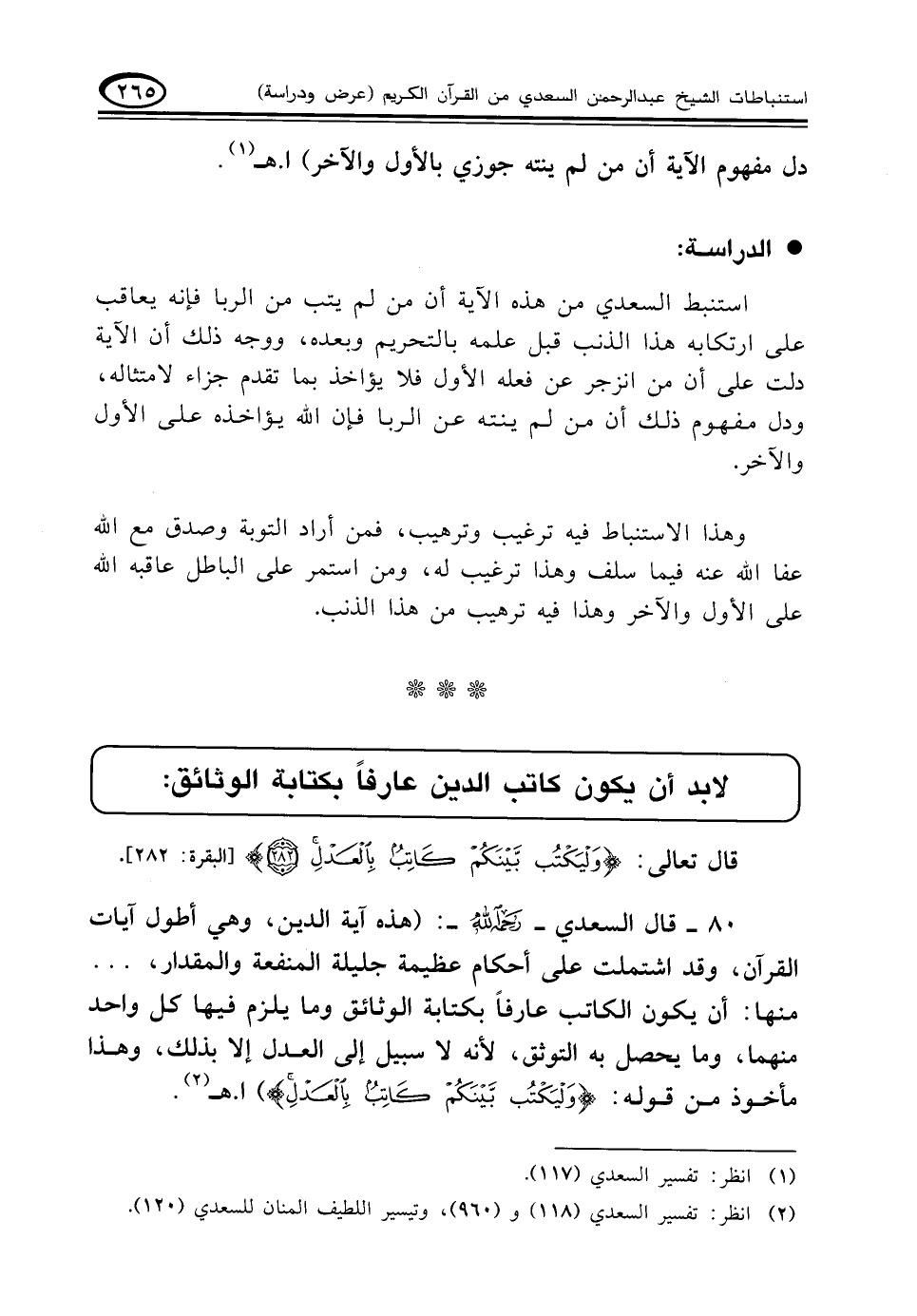 ٨٠ - قال السعدي -رحمه الله-: (هذه آية الدين، وهي أطول آيات القرآن، وقد اشتملت على أحكام عظيمة جليلة المنفعة والمقدار، . . . منها: أن يكون الكاتب عارفاً بكتابة الوثائق وما يلزم فيها كل واحد منهما، وما يحصل به التوثق، لأنه لا سبيل إلى العدل إلا بذلك، وهذا مأخوذ من قوله: {وَلْيَكْتُبْ بَيْنَكُمْ كَاتِبٌ بِالْعَدْلِ}) ا. هـ (¬٢)