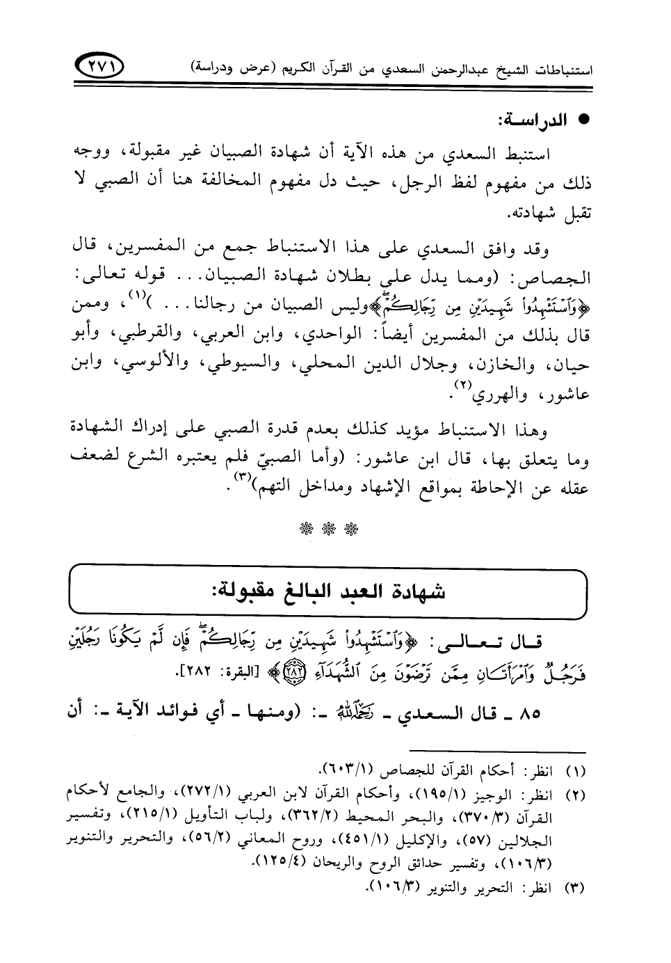 وقد وافق السعدي على هذا الاستنباط جمع من المفسرين، قال الجصاص: ومما يدل على بطلان شهادة الصبيان. . . قوله تعالى: {وَاسْتَشْهِدُوا شَهِيدَيْنِ مِنْ رِجَالِكُمْ} وليس الصبيان من رجالنا. . .) (¬١)، وممن قال بذلك من المفسرين أيضاً: الواحدي، وابن العربي، والقرطبي، وأبوحيان، والخازن، وجلال الدين المحلي، والسيوطي، والألوسي، وابن عاشور، والهرري (¬٢).