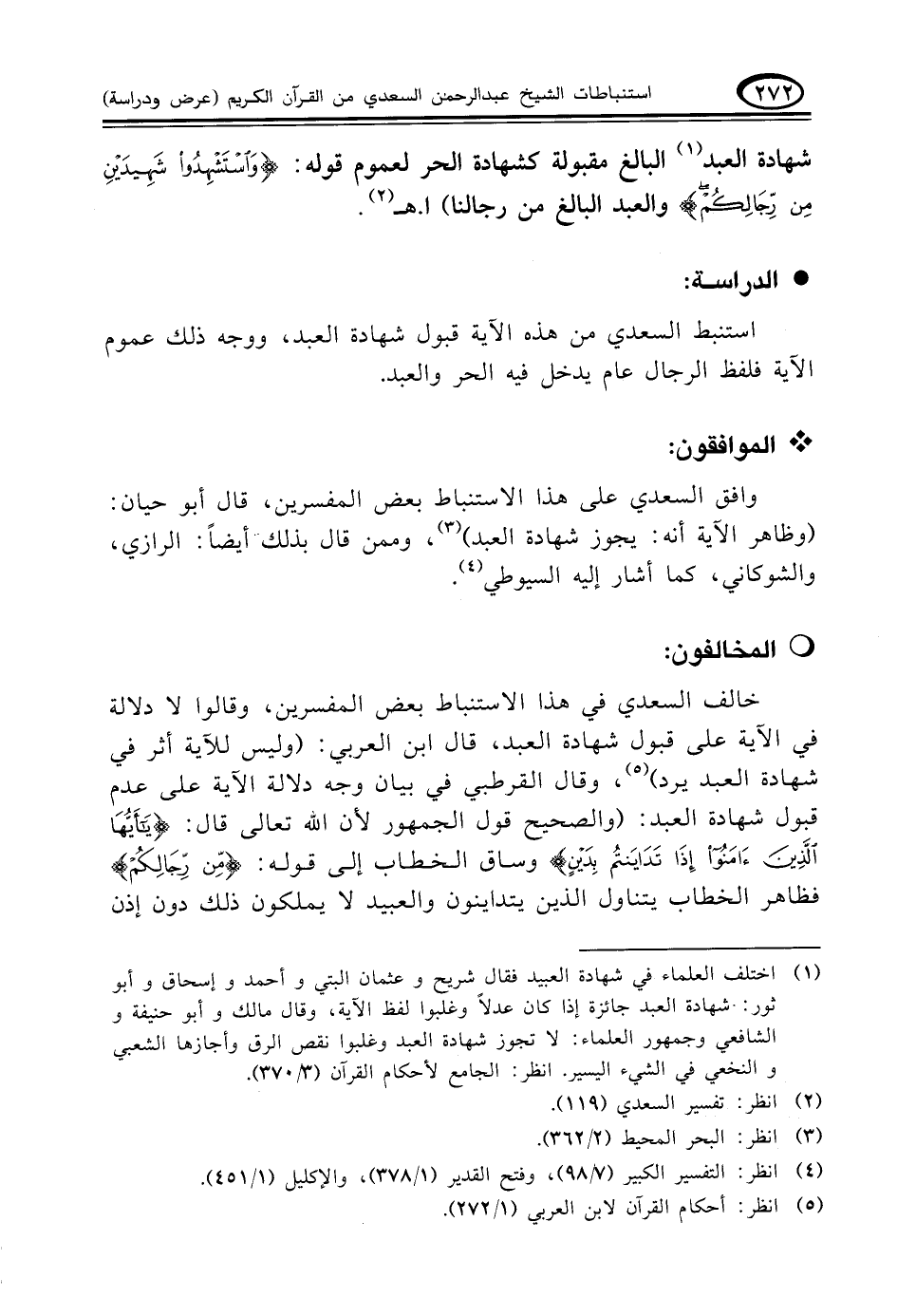 خالف السعدي في هذا الاستنباط بعض المفسرين، وقالوا لا دلالة في الآية على قبول شهادة العبد، قال ابن العربي: (وليس للآية أثر في شهادة العبد يرد) (¬٥)، وقال القرطبي في بيان وجه