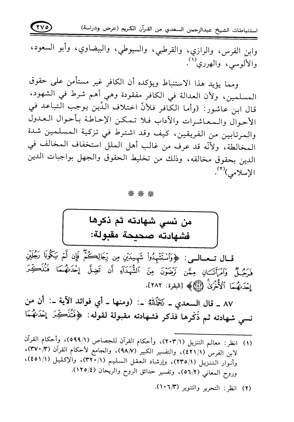٨٧ - قال السعدي -رحمه الله-: (ومنها-أي فوائد الآية-: أن من نسي شهادته ثم ذُكّرها فذكر فشهادته مقبولة لقوله: {فَتُذَكِّرَ إِحْدَاهُمَا