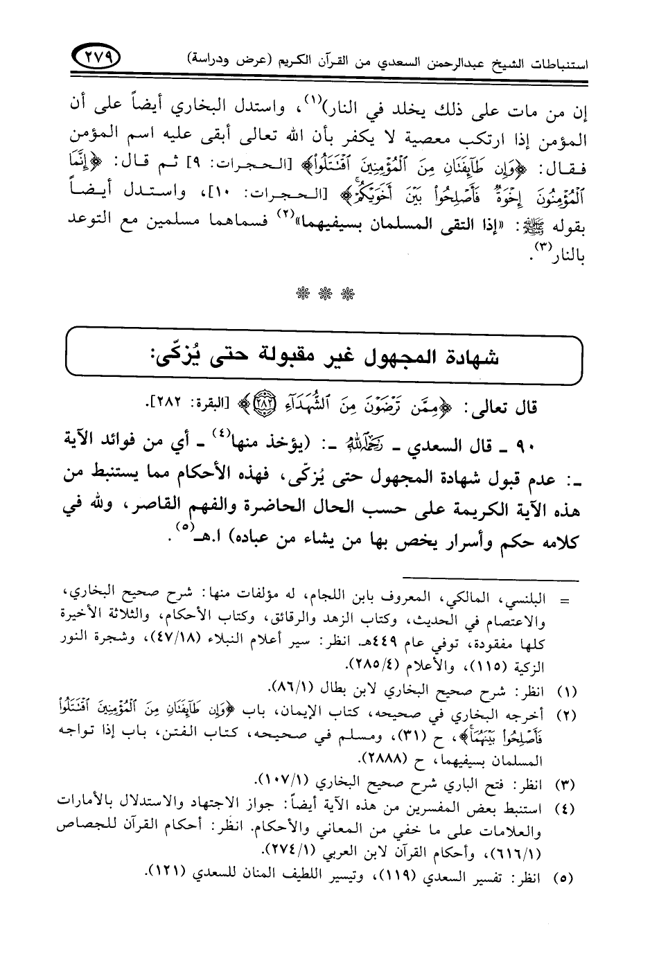 ٩٠ - قال السعدي -رحمه الله-: (يؤخذ منها (¬٤) -أي من فوائد الآية-: عدم قبول شهادة المجهول حتى يُزكّى، فهذه الأحكام مما يستنبط من هذه الآية الكريمة على حسب الحال الحاضرة والفهم القاصر، ولله في كلامه حكم وأسرار يخص بها من يشاء من عباده) ا. هـ (¬٥)