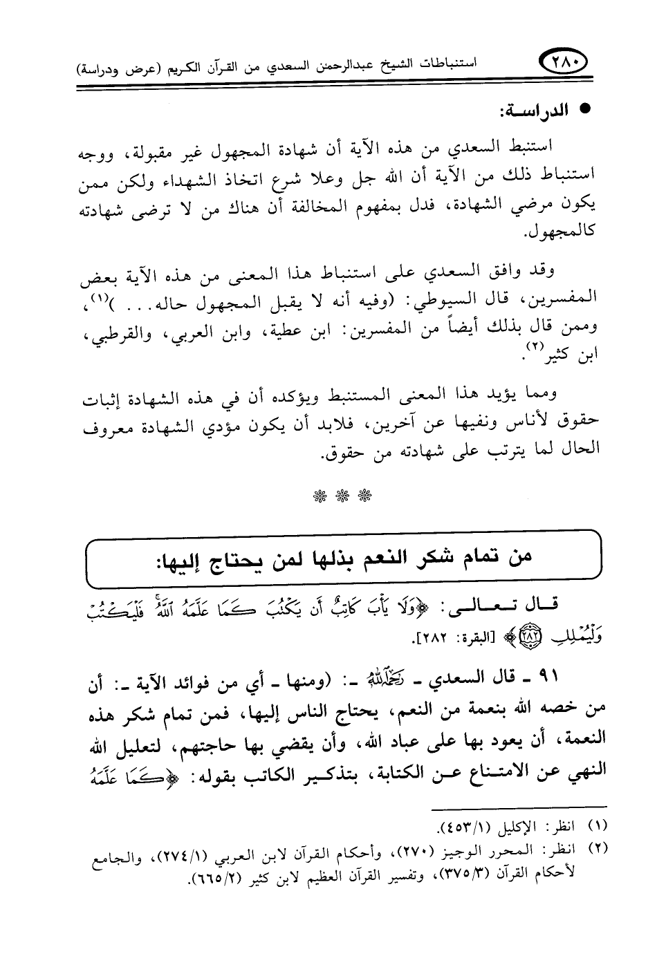 ٩١ - قال السعدي -رحمه الله-: (ومنها-أي من فوائد الآية-: أن من خصه الله بنعمة من النعم، يحتاج الناس إليها، فمن تمام شكر هذه النعمة، أن يعود بها على عباد الله، وأن يقضي بها حاجتهم، لتعليل الله النهي عن الامتناع عن الكتابة، بتذكير الكاتب بقوله: {كَمَا عَلَّمَهُ
