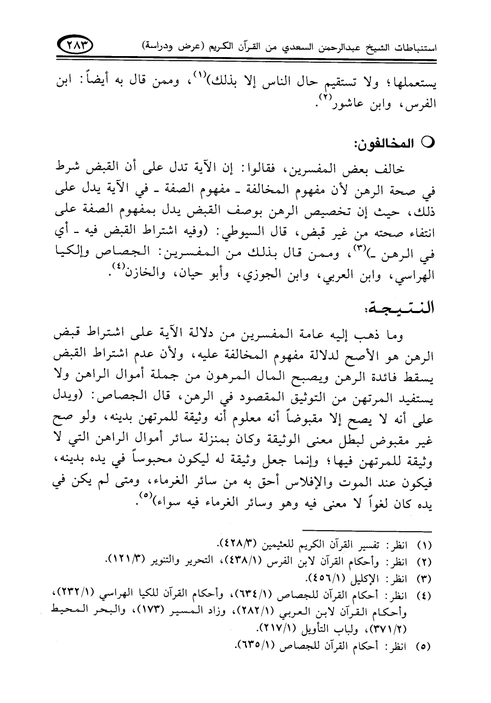 خالف بعض المفسرين، فقالوا إن الآية تدل على أن القبض شرط في صحة الرهن لأن مفهوم المخالفة - مفهوم الصفة - في الآية يدل على ذلك، حيث إن تخصيص الرهن بوصف القبض يدل بمفهوم الصفة على انتفاء صحته من غير قبض، قال السيوطي: (وفيه اشتراط القبض فيه - أي في الرهن-) (¬٣)، وممن قال بذلك من المفسرين: الجصاص وإلكيا الهراسي، وابن العربي، وابن الجوزي، وأبو حيان، والخازن (¬٤).