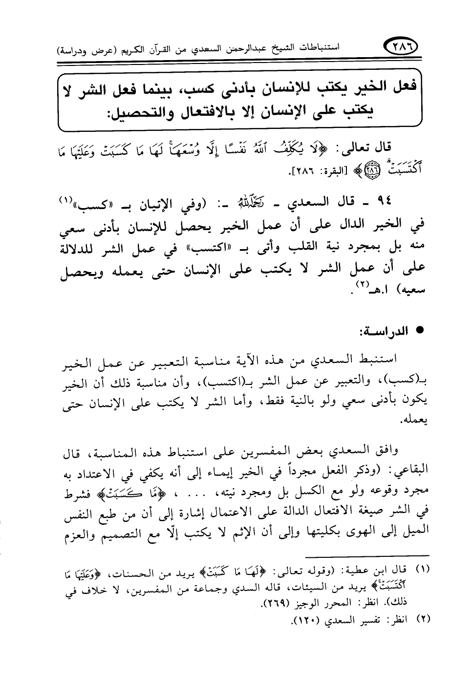 ٩٤ - قال السعدي -رحمه الله-: (وفي الإتيان بـ "كسب " (¬١) في الخير الدال على أن عمل الخير يحصل للإنسان بأدنى سعي منه بل بمجرد نية القلب وأتى بـ "اكتسب "في عمل الشر للدلالة على أن عمل الشر لا يكتب على الإنسان حتى يعمله ويحصل سعيه) ا. هـ (¬٢)