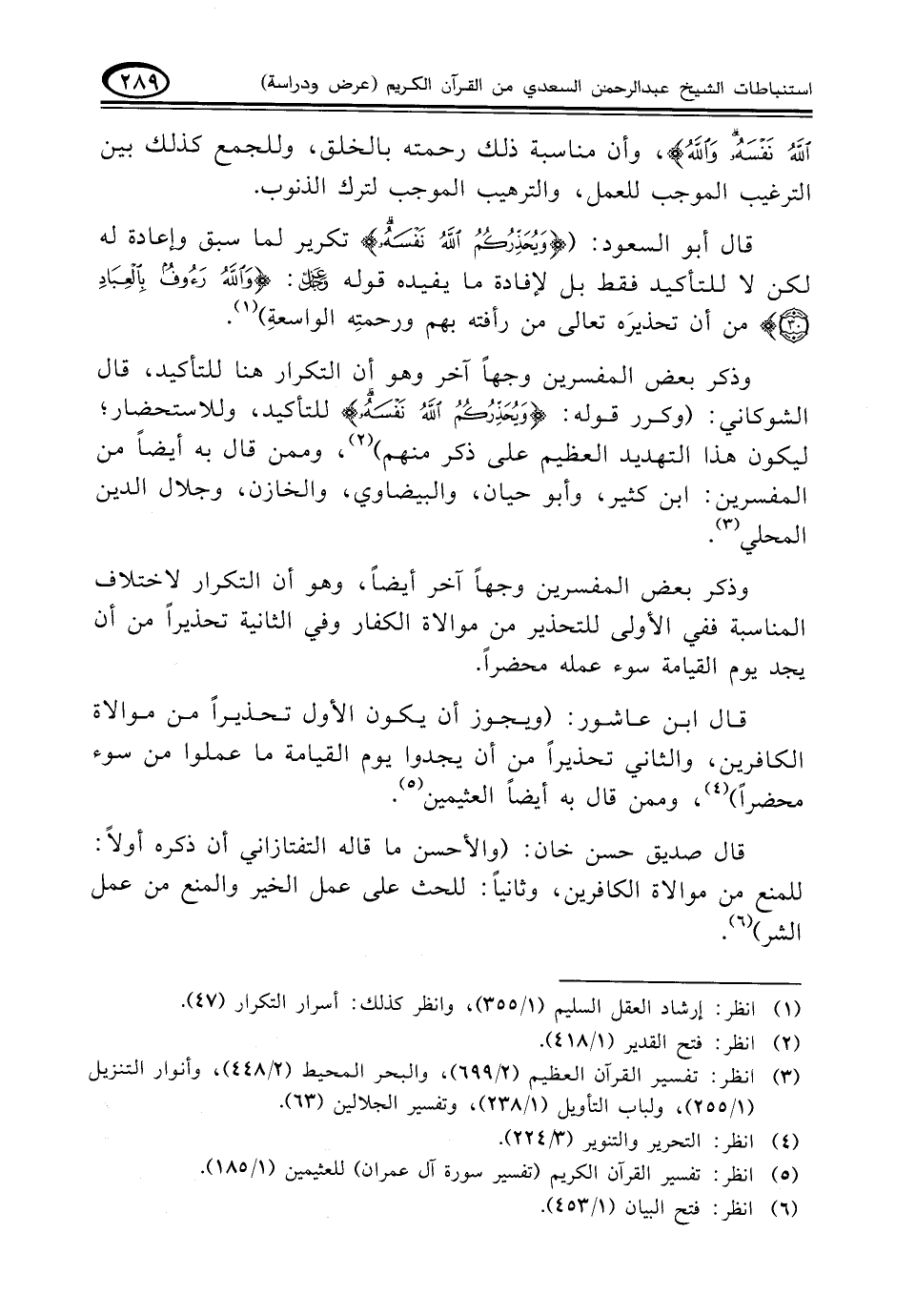 قال أبو السعود: ({وَيُحَذِّرُكُمُ اللَّهُ نَفْسَهُ} تكرير لما سبق وإعادة له لكن لا للتأكيد فقط بل لإفادة ما يفيده قوله عز وجل: {وَاللَّهُ رَءُوفٌ بِالْعِبَادِ (٣٠)} من أن تحذيرَه تعالى من رأفته بهم ورحمتِه الواسعةِ) (¬١).