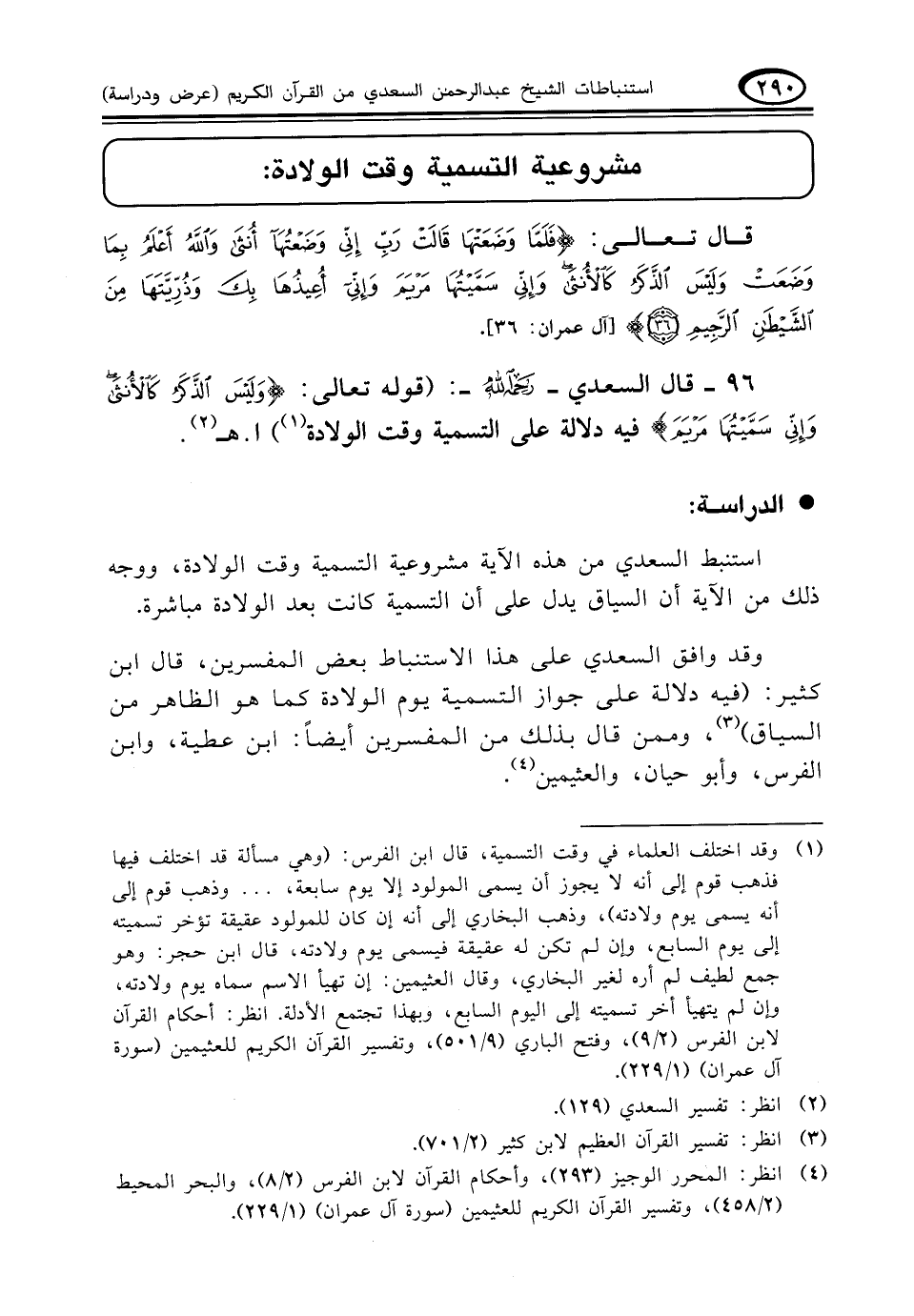 وقد وافق السعدي على هذا الاستنباط بعض المفسرين، قال ابن كثير: (فيه دلالة على جواز التسمية يوم الولادة كما هو الظاهر من السياق) (¬٣)، وممن قال بذلك من المفسرين أيضاً: ابن عطية، وابن الفرس، وأبوحيان، والعثيمين (¬٤).