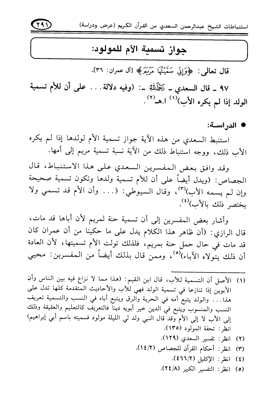 وقد وافق بعض المفسرين السعدي على هذا الاستنباط، قال الجصاص: (ويدل أيضاً على أن للأم تسمية ولدها وتكون تسمية صحيحة وإن لم يسمه الأب) (¬٣)، وقال السيوطي: (. . . وأن الأم قد تسمي ولا يختصر ذلك بالأب) (¬٤).