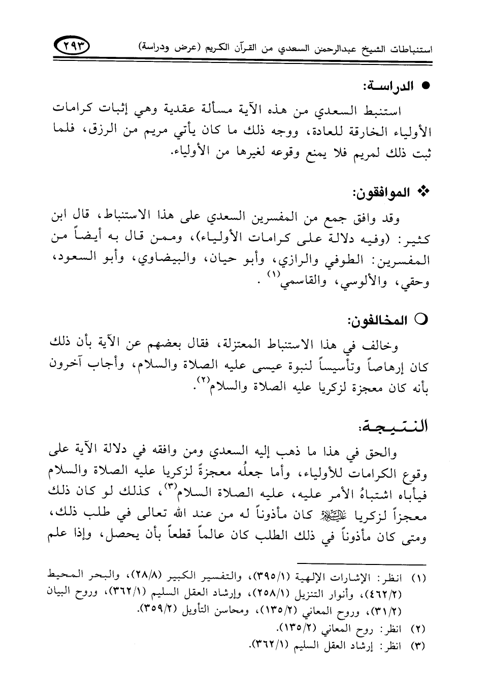 وقد وافق جمع من المفسرين السعدي على هذا الاستنباط، قال ابن كثير: (وفيه دلالة على كرامات الأولياء)، وممن قال به أيضاً من المفسرين: الطوفي، والرازي، وأبو حيان، والبيضاوي، وأبو السعود، وحقي، والألوسي، والقاسمي (¬١).