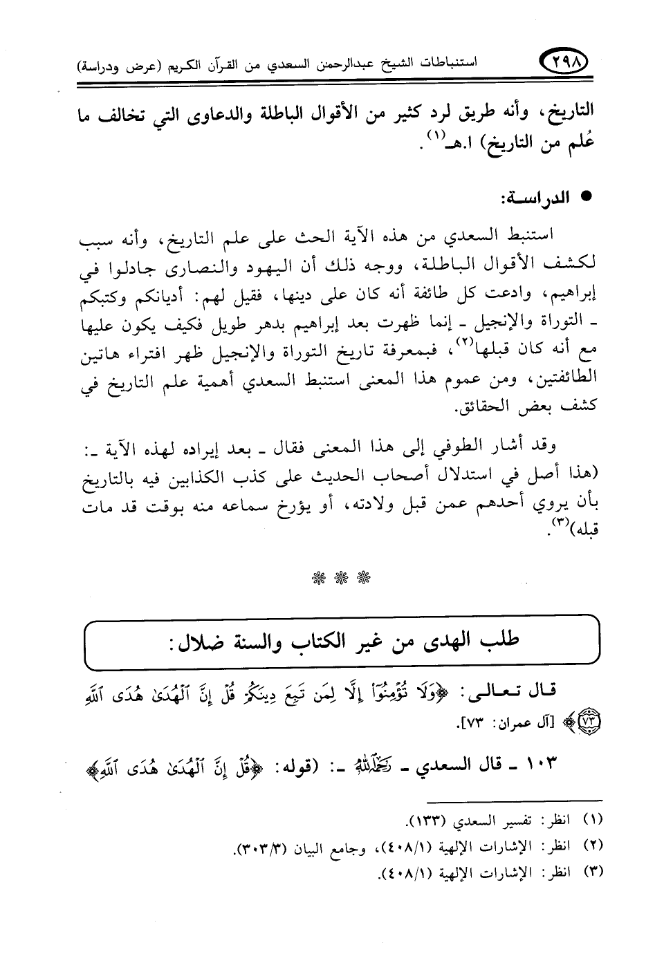 استنبط السعدي من هذه الآية الحث على علم التاريخ، وأنه سبب لكشف الأقوال الباطلة، ووجه ذلك أن اليهود والنصارى جادلوا في إبراهيم، وادعت كل طائفة أنه كان على دينها، فقيل لهم: أديانكم وكتبكم - التوراة والإنجيل - إنما ظهرت بعد إبراهيم بدهر طويل فكيف يكون عليها مع أنه كان قبلها (¬٢)، فبمعرفة تاريخ التوراة والإنجيل ظهر افتراء هاتين الطائفتين، ومن عموم هذا المعنى استنبط السعدي أهمية علم التاريخ في كشف بعض الحقائق.