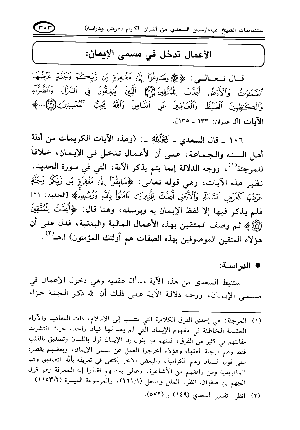 ١٠٦ - قال السعدي - رحمه الله -: (وهذه الآيات الكريمات من أدلة أهل السنة والجماعة، على أن الأعمال تدخل في الإيمان، خلافا للمرجئة (¬١)، ووجه الدلالة إنما يتم بذكر الآية، التي في سورة الحديد، نظير هذه الآيات، وهي قوله تعالى: {سَابِقُوا إِلَى مَغْفِرَةٍ مِنْ رَبِّكُمْ وَجَنَّةٍ عَرْضُهَا كَعَرْضِ السَّمَاءِ وَالْأَرْضِ أُعِدَّتْ لِلَّذِينَ آَمَنُوا بِاللَّهِ وَرُسُلِهِ} (الحديد: ٢١) فلم يذكر فيها إلا لفظ الإيمان به وبرسله، وهنا قال: {أُعِدَّتْ لِلْمُتَّقِينَ (١٣٣)} ثم وصف المتقين بهذه الأعمال المالية والبدنية، فدل على أن هؤلاء المتقين الموصوفين بهذه الصفات هم أولئك المؤمنون) ا. هـ (¬٢)