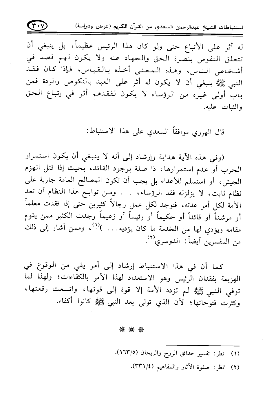 قال الهرري موافقاً السعدي على هذا الاستنباط: (وفي هذه الآية هداية وإرشاد إلى أنه لا ينبغي أن يكون استمرار الحرب أو عدم استمرارها، ذا صلة بوجود القائد، بحيث إذا قتل انهزم الجيش، أو استسلم للأعداء بل يجب أن تكون المصالح العامة جارية على نظام ثابت، لا يزلزله فقد الرؤساء، . . . ومن توابع هذا النظام أن تعد الأمة لكل أمر عدته، فتوجد لكل عمل رجالاً كثيرين حتى إذا فقدت معلماً أو مرشداً أو قائداً أو حكيماً أو رئيساً أو زعيماً وجدت الكثير ممن يقوم مقامه ويؤدي لها من الخدمة ما كان يؤديه. . .) (¬١)، وممن أشار إلى ذلك من المفسرين أيضاً: الدوسري (¬٢).