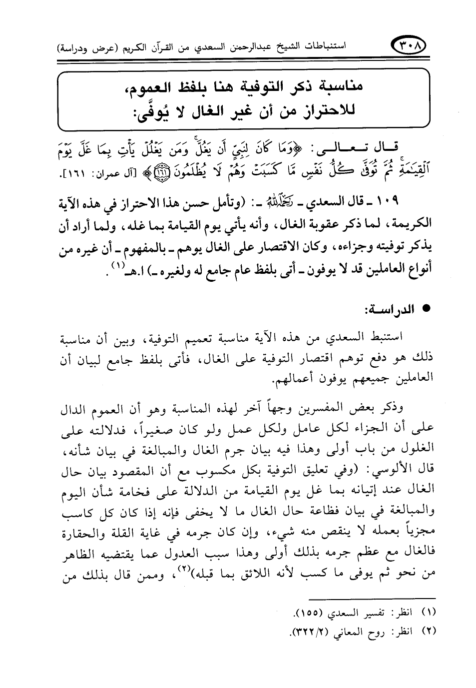 ١٠٩ - قال السعدي - رحمه الله -: (وتأمل حسن هذا الاحتراز في هذه الآية الكريمة، لما ذكر عقوبة الغال، وأنه يأتي يوم القيامة بما غله، ولما أراد أن يذكر توفيته وجزاءه، وكان الاقتصار على الغال يوهم -بالمفهوم- أن غيره من أنواع العاملين قد لا يوفون -أتى بلفظ عام جامع له ولغيره) ا. هـ (¬١)