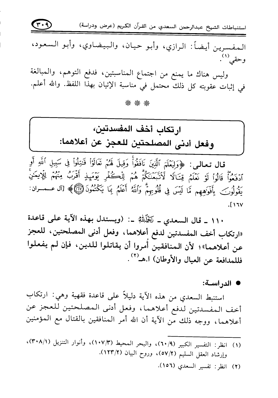 ١١٠ - قال السعدي - رحمه الله -: (ويستدل بهذه الآية على قاعدة "ارتكاب أخف المفسدتين لدفع أعلاهما، وفعل أدنى المصلحتين، للعجز عن أعلاهما"؛ لأن المنافقين أُمروا أن يقاتلوا للدين، فإن لم يفعلوا فللمدافعة عن العيال والأوطان) ا. هـ (¬٢)