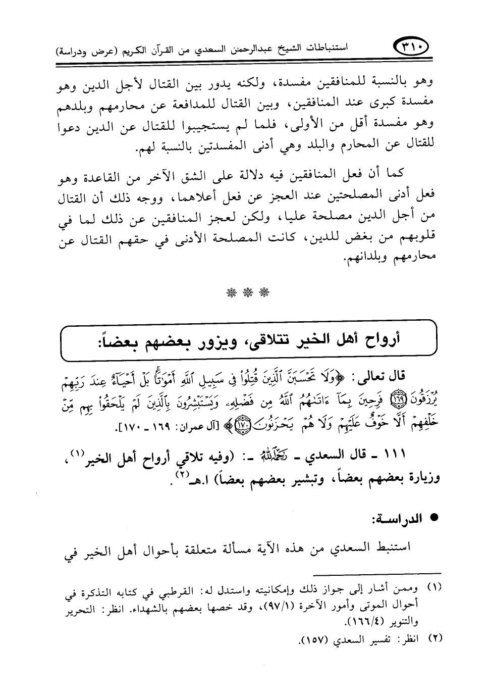 ١١١ - قال السعدي - رحمه الله -: (وفيه تلاقي أرواح أهل الخير (¬١)، وزيارة بعضهم بعضاً، وتبشير بعضهم بعضاً) ا. هـ (¬٢)