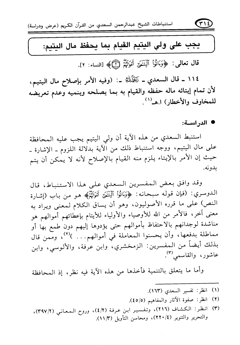 ١١٤ - قال السعدي - رحمه الله -: (وفيه الأمر بإصلاح مال اليتيم، لأن تمام إيتائه ماله حفظه والقيام به بما يصلحه وينميه وعدم تعريضه للمخاوف والأخطار) ا. هـ (¬١)