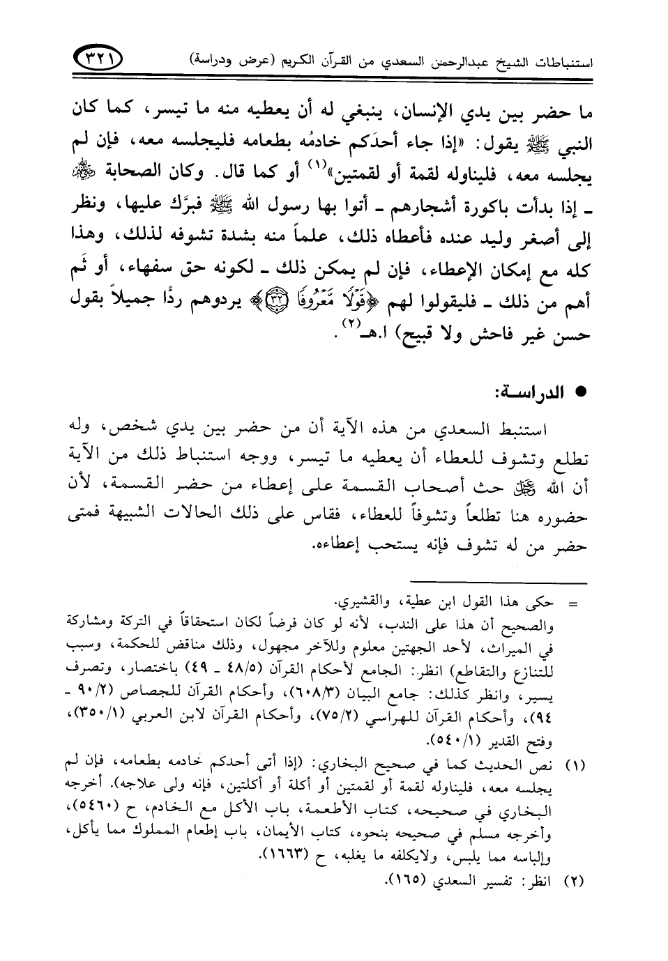 استنبط السعدي من هذه الآية أن من حضر بين يدي شخص، وله تطلع وتشوف للعطاء أن يعطيه ما تيسر، ووجه استنباط ذلك من الآية أن الله عز وجل حث أصحاب القسمة على إعطاء من حضر القسمة، لأن حضوره هنا تطلعاً وتشوفاً للعطاء، فقاس على ذلك الحالات الشبيهة فمتى حضر من له تشوف فإنه يستحب إعطاءه.