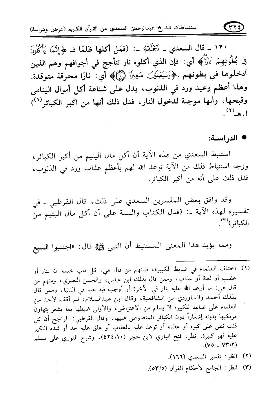وقد وافق بعض المفسرين السعدي على ذلك، قال القرطبي-في تفسيره لهذه الآية-: (فدل الكتاب والسنة على أن أكل مال اليتيم من الكبائر) (¬٣).