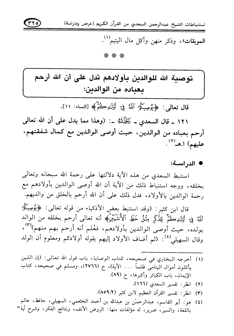 ١٢١ - قال السعدي - رحمه الله -: (وهذا مما يدل على أن الله تعالى أرحم بعباده من الوالدين، حيث أوصى الوالدين مع كمال شفقتهم، عليهم) ا. هـ (¬٢)