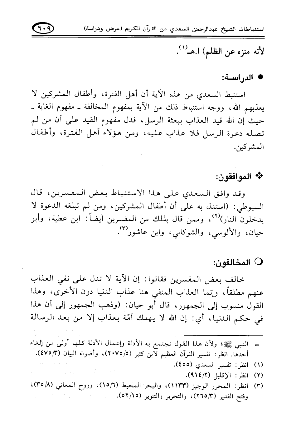 وقد وافق السعدي على هذا الاستنباط بعض المفسرين، قال السيوطي: (استدل به على أن أطفال المشركين، ومن لم تبلغه الدعوة لا يدخلون النار) (¬٢)، وممن قال بذلك من المفسرين أيضاً: ابن عطية، وأبوحيان، والألوسي، والشوكاني، وابن عاشور. (¬٣)