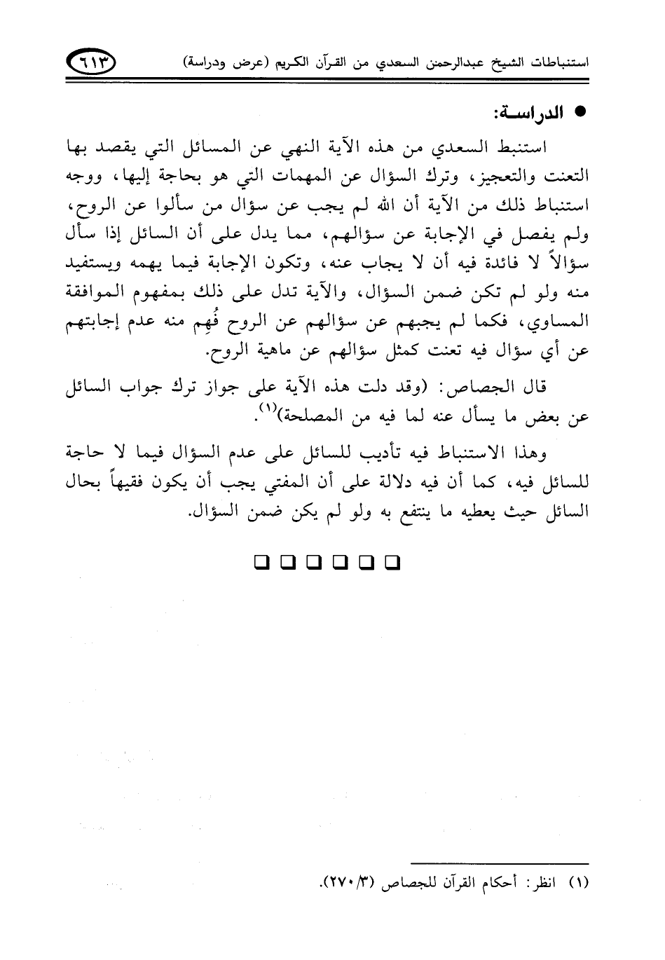 قال الجصاص: (وقد دلت هذه الآية على جواز ترك جواب السائل عن بعض ما يسأل عنه لما فيه من المصلحة) (¬١).