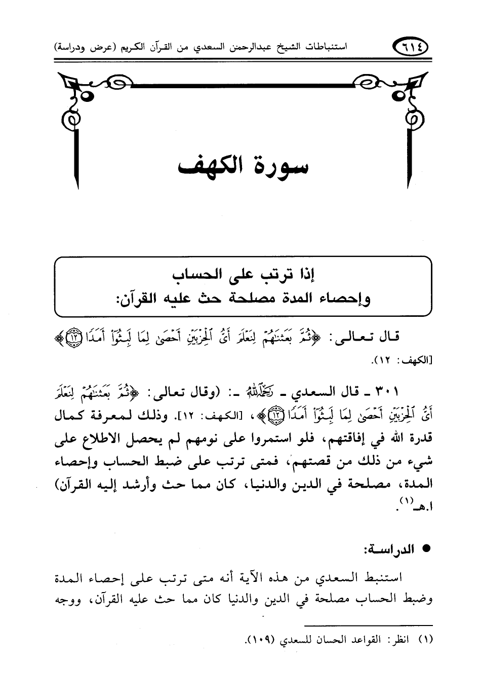 ٣٠١ - قال السعدي - رحمه الله -: (وقال تعالى: {ثُمَّ بَعَثْنَاهُمْ لِنَعْلَمَ أَيُّ الْحِزْبَيْنِ أَحْصَى لِمَا لَبِثُوا أَمَدًا (١٢)}، [الكهف: ١٢]، . وذلك لمعرفة كمال قدرة الله في إفاقتهم، فلو استمروا على نومهم لم يحصل الاطلاع على شيء من ذلك من قصتهم، فمتى ترتب على ضبط الحساب وإحصاء المدة، مصلحة في الدين والدنيا، كان مما حث وأرشد إليه القرآن). ا. هـ (¬١)