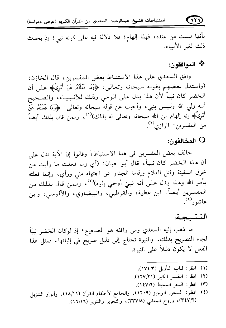 ما ذهب إليه السعدي ومن وافقه هو الصحيح؛ إذ لوكان الخضر نبياً لجاء التصريح بذلك، والنبوة تحتاج إلى دليل صريح في إثباتها، فمثل هذا الفعل لا يكون دليلاً على النبوة.